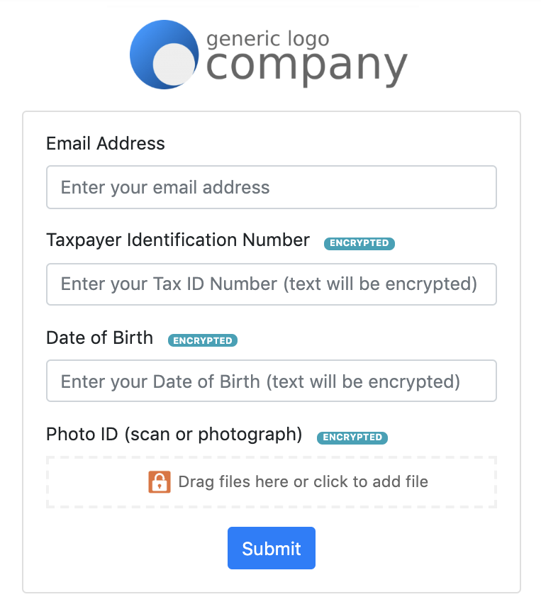 Use our Dropzone API to build your own custom web form with field-level form encryption for protecting submitted data. Our form runs on any platform with no server-side coding required.